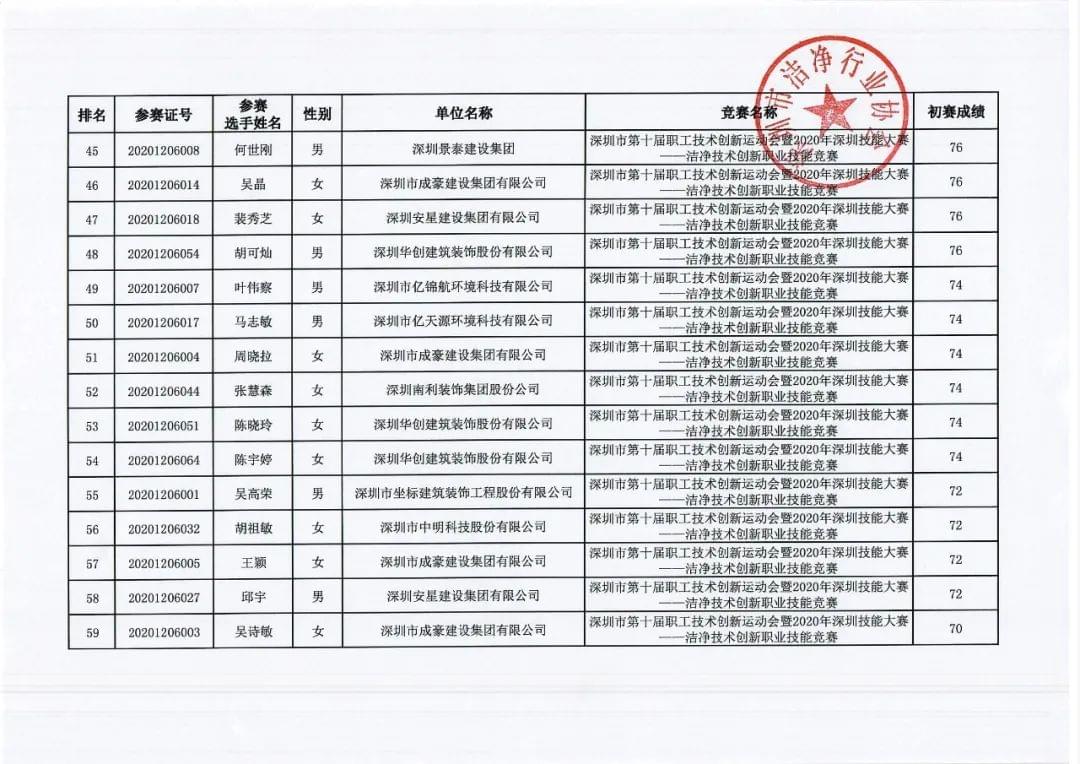 深圳市第十届职工技术创新运动会暨2020年深圳技能大赛——洁净技术创新职业技能竞赛初赛成绩公布